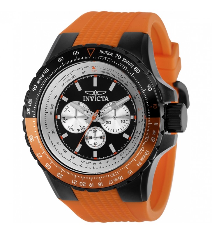 Invicta muški sat iz kolekcije Aviator. Prečnik: 50 mm. Kućište: nerđajući čelik crne boje. Narukvica: silikon narandzaste boje. Vodootpornost: 10 ATM. Ovaj model dolazi sa fabrickom garancijom od dvije godine.